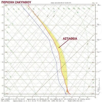 Επισυνάπτουμε και ένα προγνωστικό τεφιγραμμα για την ευρύτερη περιοχή της Ζακύνθου με αρκετή αστάθεια και υγρασία σχεδόν 100% καθόλο το ύψος της ατμόσφαιρας.