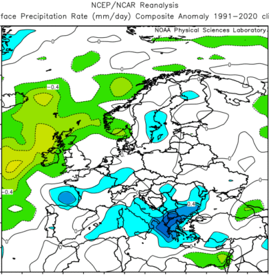 Βροχοπτώσεις πάνω από τις κανονικής ή στις κανονικές τιμές τιμές στο μεγαλύτερο μέρος της Ευρώπης με ιδιαίτερη έμφαση στη δυτική νοτιοδυτική Ευρώπη και όλη τη Μεσόγειο συμπεριλαμβανομένου και της χώρας μας που θα δεχτεί αξιόλογες ή και πάνω από τις κανονικές βροχοπτώσεις.