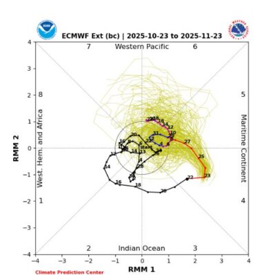 Σύμφωνα λοιπόν με τα προγνωστικά στοιχεία από το ευρωπαϊκό προγνωστικό μοντέλο (ECMWF) καθώς και από την κίνηση του δείκτη MJO ο οποίος μας δείχνει το γενικό μοτίβο του καιρού ανα εβδομάδα για τις επόμενες 40 ημέρες έχουμε να πούμε τα εξής: