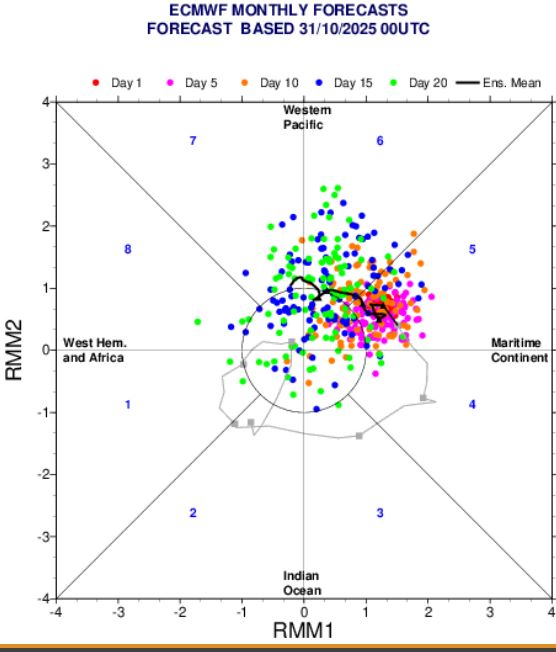 Για τον μήνα Νοέμβριο συγκεντρώσαμε όλα τα προγνωστικά στοιχεία και ξεκινάμε με την ανάλυση του δείκτη MJO. Κατά τη διάρκεια αυτού του μήνα η κίνησή του θα είναι από την φάση 5 στις φάσεις 6 και 7. Επίσης πρέπει να τονίσουμε ότι βρισκόμαστε και σε φάση ασθενούς LA-NINA που φαίνεται να διαρκεί για τουλάχιστον άλλους 2 με 3 μήνες.