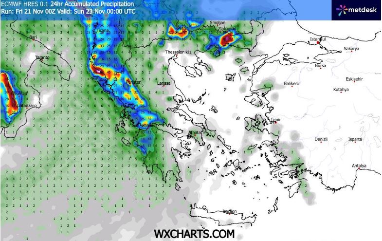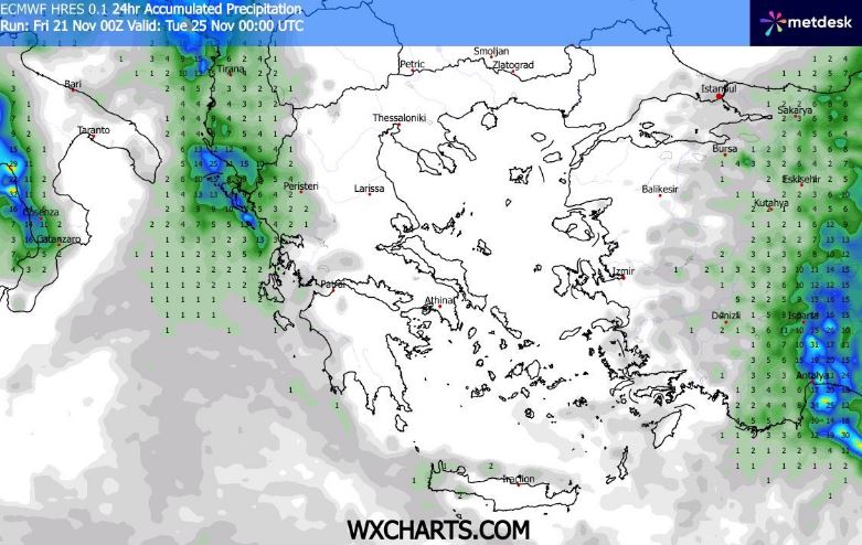 Προβλέπεται στη δυτική Ελλάδα και τα νησιά του Ιονίου άστατος καιρό με τοπικές μπόρες κάτα περιόδους ενώ πρόσκαιρα τις πρωινές ώρες θα σημειωθούν και κάποια φαινόμενα στους νομούς Σερρών Δράμας Καβάλας Ξάνθης Ροδόπης και Έβρου καθώς και στη δυτική Μακεδονία. Προς το μεσημέρι δεν αποκλείεται τοπικά πρόσκαιρα φαινόμενα να επηρεάσουν την Θεσσαλία την κεντρική Στερεά Ελλάδα την κεντρική Πελοπόννησο και ενδεχομένως για πολύ λίγο κάποια νησιά του ανατολικού Αιγαίου με σταδιακή βελτίωση προς το βράδυ. Επισημαίνεται ότι τα φαινόμενα πιθανώς να είναι ισχυρά στο εσωτερικό της Ηπείρου στους νομούς Ευρυτανίας Αιτωλοακαρνανίας τα ορεινά της δυτικής Πελοποννήσου και τα ορεινά της ανατολικής Μακεδονίας και Θράκης όπου κατά τόπους θα σημειωθούν και πάνω από 30 με 50 mm.
