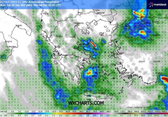 Πρόγνωση Ελλάδας και ξεχωριστά Θεσσαλίας και Λάρισας για 7-9/12/2025+ XΑΡΤΕΣ ΒΡΟΧΗΣ.