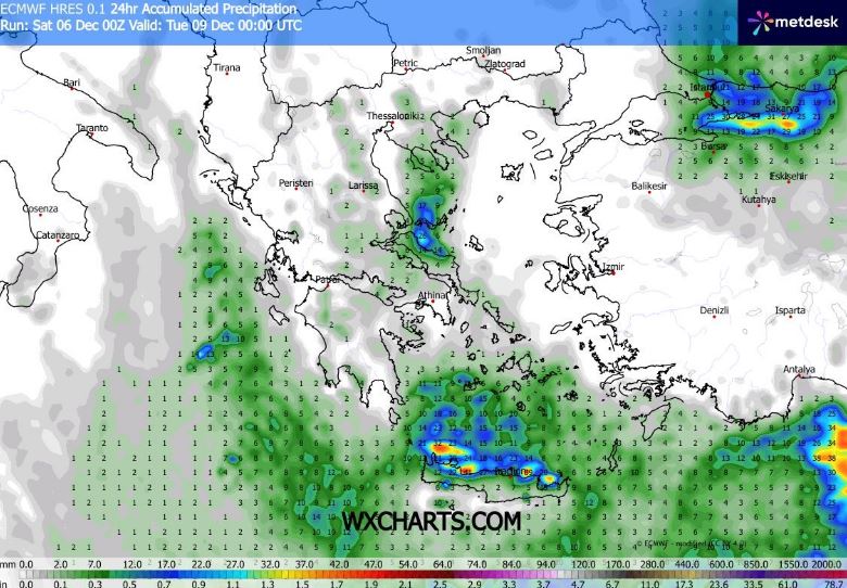 Πρόγνωση Ελλάδας και ξεχωριστά Θεσσαλίας και Λάρισας για 7-9/12/2025+ XΑΡΤΕΣ ΒΡΟΧΗΣ.