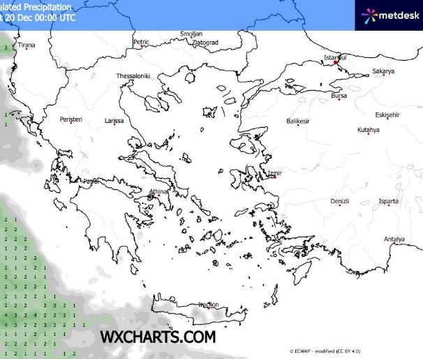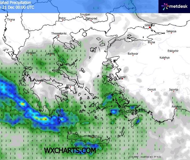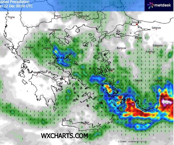 Προβλέπεται στη Θεσσαλία την Ήπειρο την Στερεά Ελλάδα το κεντρικό και βόρειο Αιγαίο τις Κυκλάδες και τις Σποράδες νεφώσεις με σποραδικές βροχές ενώ στα Δωδεκάνησα θα σημειώνονται και σποραδικές καταιγίδες φαινόμενα τα οποία θα διατηρηθούν στα τα διαστήματα έως και αργά το βράδυ. Σταδιακά αργά τη νύχτα θα αρχίσουν να σημειώνονται κάποια φαινόμενα και στη δυτική και κεντρική Μακεδονία αλλά και τη Θράκη. Ασθενείς χιονοπτώσεις θα σημειωθούν κυρίως στα ορεινά τμήματα της Θεσσαλίας της Μακεδονίας και της Θράκης πάνω από τα 1200 με 1400 μέτρα υψόμετρο και πάνω από τα 1500 με 1800 στα υπόλοιπα ηπειρωτικά. Επισημαίνεται ότι τα φαινόμενα θα είναι αξιόλογα στα παραθαλάσσια τμήματα της Θεσσαλίας στα βόρεια της Εύβοιας όπου θα σημειωθούν κατά τόπους και πάνω από 20-25 mm βροχής ενώ θα είναι έντονα σε νησιά του ανατολικού Αιγαίου όπως Σάμο Κω Κάλυμνο Ρόδο Ικαρία Καστελόριζο οπου κατά τόπους θα σημειωθούν και πάνω από 50 mm βροχής.