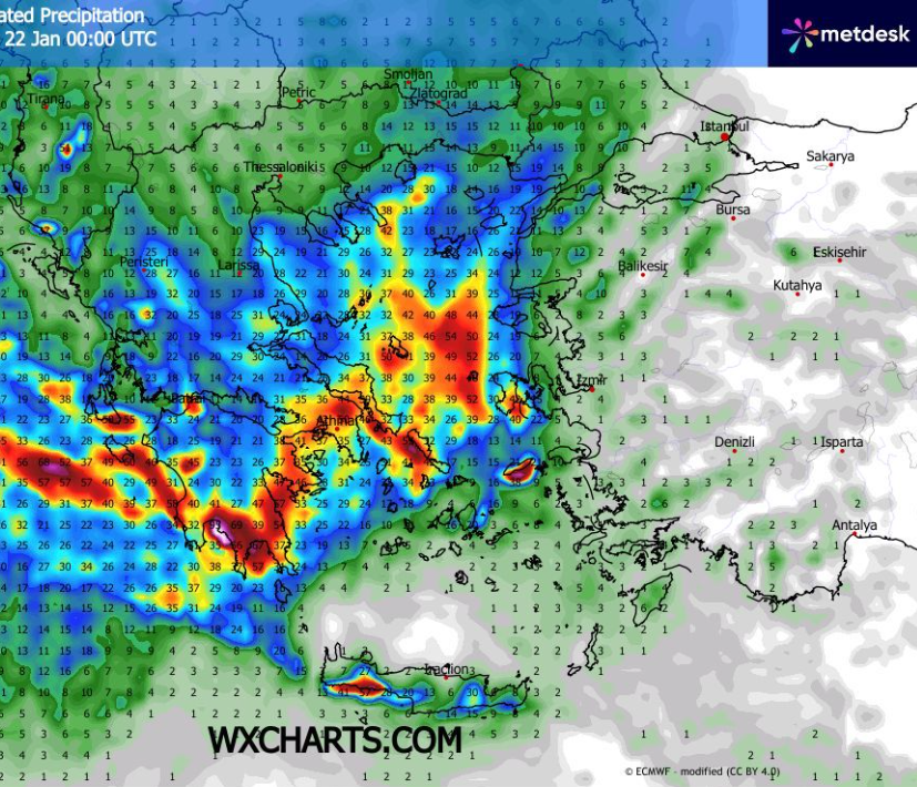 Προβλέπονται τοπικές νεφώσεις σε όλη τη χώρα με χιονοπτώσεις στη δυτική Μακεδονία τα ορείνα και ημιορεινά της Ηπείρου της κεντρικής Στερεάς και της Θεσσαλίας και τα ορεινά της υπόλοιπης ηπειρωτικής χώρας και λίγες τοπικές βροχές στα νησιά του Ιονίου της Σποράδες την Κρήτη και τις Κυκλάδες ενώ όσο πάμε προς το πρωί τα φαινόμενα θα ενταθούν και στα νησιά του Ιονίου και την νότια Πελοπόννησο που θα εκδηλώνονται και παροδικές καταιγίδες και όσο πάμε προς το μεσημέρι φαινόμενα θα αρχίσουν να εκδηλώνονται στο μεγαλύτερο μέρος του Αιγαίου και έως αργά το απόγευμα σε πολλές περιοχές της Μακεδονίας και της Θράκης. Οι χιονοπτώσεις στην αρχή της ημέρας θα απασχολούν ορεινά τμήματα της Πελοποννήσου πάνω από τα 1000m της Στερεάς Ελλάδας και της νότιαοανατολικής Θεσσαλίας πάνω από τα 600 με 800 μέτρα της Ηπείρου πάντα με 600 μέτρα της δυτικής και βόρειας Θεσσαλίας από τα 200 με 400 m της Μακεδονίας και της Θράκης πάνω από τα 50 με 150 μέτρα υψόμετρο αλλά σταδιακά όσο πάμε προς το μεσημέρι προς θα κατέβουν στην δυτική και βόρεια Θεσσαλία στα 100 με 300 μέτρα υψόμετρο και πάνω από τα 100 με 150 μέτρα στην κεντρική ανατολική Μακεδονία καθώς και στον Έβρο ενώ στις υπόλοιπες παραθαλάσσιές περιοχές της Θεσσαλίας της Μακεδονίας και της Θράκης τα υψόμετρα θα ανεβαίνουν σημαντικά όσο περνάει η μέρα. Επισημαίνεται ότι τα φαινόμενα θα είναι έντονα σε τμήματα των Σποράδων γύρω από τη Σκύρο στο κεντρικό και νότια τμήμα της Εύβοιας στην Αττικοβοιωτία την Αργολίδα την Κορινθία την Αρκαδία τη Μεσσηνία την Ηλεία τη Λακωνία τα νότια του νομού Χανίων και ενδεχομένως στην Κεφαλονιά και τη Ζάκυνθο ενώ χιονοπτώσεις θα είναι πολύ πυκνές στα ορεινά της Θεσσαλίας της κεντρικής Στερεάς και της κεντρικής Πελοποννήσου.