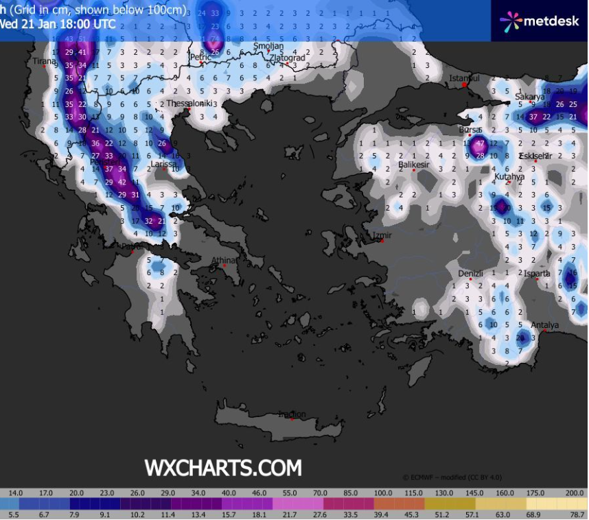 Θεσσαλία και Σποράδες: προβλέπονται τοπικές νεφώσεις με εναλλαγή χιονόνερου ή και χιονιού ακόμα και στα πεδινά στο μεγαλύτερο μέρος του νομού Τρικάλων Καρδίτσας την περιοχή Φαρσάλων και Ελασσόνας ενώ για λίγο τις πρωινές και μεσημεριανές ώρες θα υπάρξει χιονόνερο και στα υπόλοιπα τμήματα του νομού Λάρισας ενώ στο νομό Μαγνησίας και τις Σποράδες θα σημειώνονται βροχές και χιόνια πάνω από τα 500 με 700 μέτρα υψόμετρο με βελτίωση σημαντική σε όλο το διαμέρισμα από το απόγευμα προς το βράδυ και μετά. Επισημαίνεται ότι χιονοπτώσεις στα ορείνα και ημιορεινά τμήματα της περιφέρειας θα είναι ισχυρές ιδιαίτερα στο νομό Τρικάλων Καρδίτσας Κισσάβου και Ολύμπου και οι βροχές στο νομό Μαγνησίας και τις Σποράδες. Μεγάλο ύψος χιονιού πάνω από 30 με 50 εκατοστά στα ορείνα κυρίως της δυτικής και βόρειας Θεσσαλίας λίγο μικρότερος στα υπόλοιπα βουνά της περιφέρειας ενώ για πεδινές περιοχές η πιθανότητα για ένα ελαφρύ πασπάλισμα υπάρχει για περιοχές κοντά στα βουνά όπως στο Μουζάκι την Καρδίτσα την Καλαμπάκα τα Φάρσαλα και τα Τρίκαλα για λίγη ώρα.