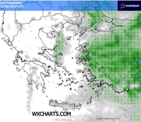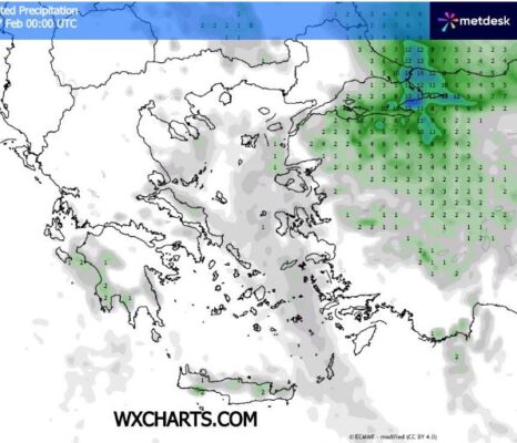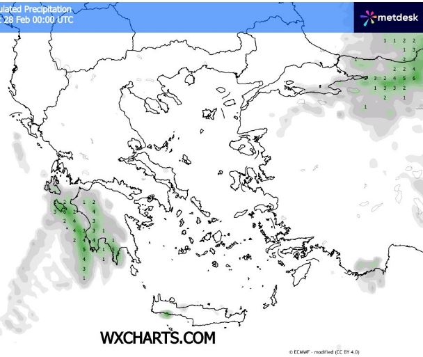 Θερμοκρασία από – 4 έως 13 βαθμούς κελσίου σε Μακεδονία Θράκη Θεσσαλία ανατολική Στερεά ανατολική Πελοπόννησο και το μεγαλύτερο μέρος του Αιγαίου και από 5 έως 16 βαθμούς κελσίου στη δυτική Ελλάδα και τα Δωδεκάνησα .