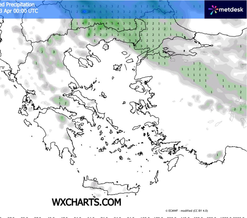 Θερμοκρασία, από 3 έως 13-16°C στην ανατολική Μακεδονία και Θράκη έως 19-20°C στα παραθαλάσσια και νησιωτικά τμήματα της χώρας και ως 21-23°C στο εσωτερικό της ηπειρωτικής χώρας.